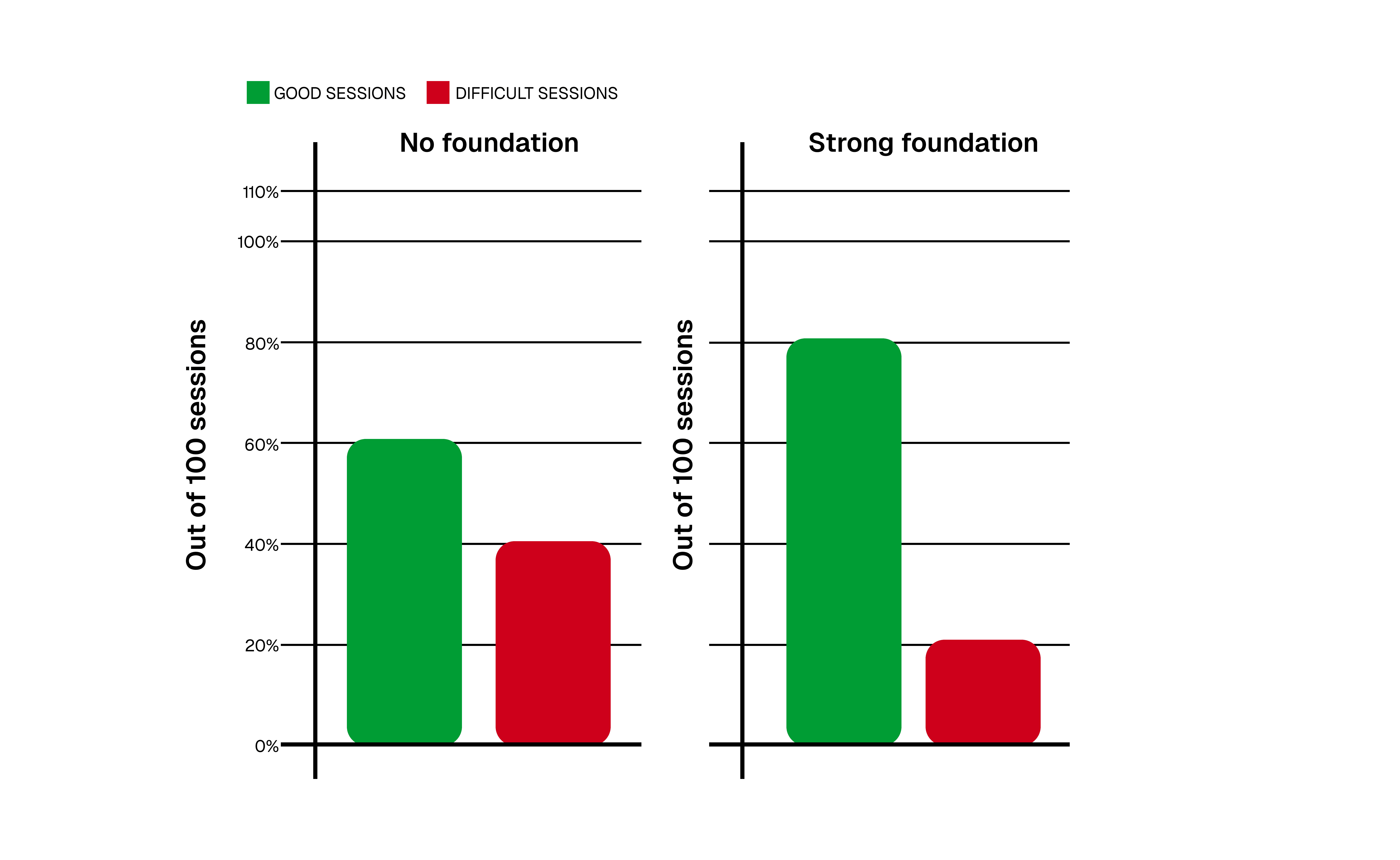 Think of it as a distribution. Out of 100 sessions, maybe 60 are good and 40 are difficult right now. That is where you start. By working on your foundation, your mindset, your goal clarity, your plan, your discipline, you shift that distribution. 60 becomes 65. Then 70. Then 80. The bad sessions do not disappear, but they shrink in frequency and in impact.